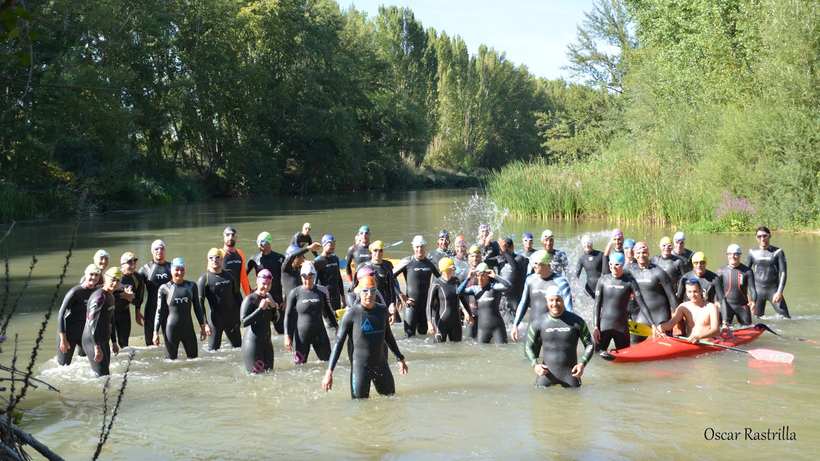 juntamos 42 nadadores dispuestos a nadar por el rio Pisuerga unos 3.500 m.